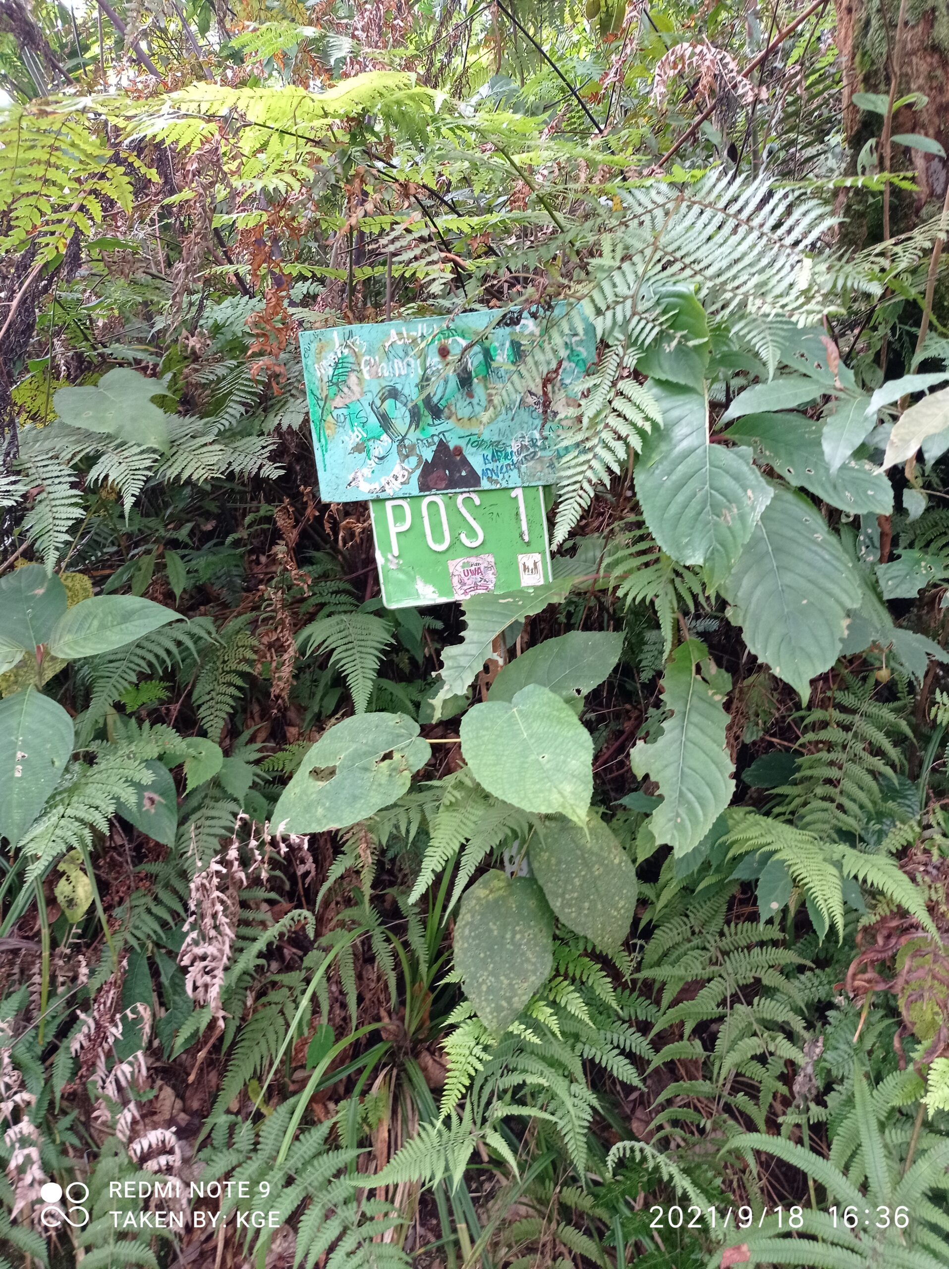 Setelah sekitar 30 menitan berjalan dengan beberapa kali istirahat karena capek akhirnya kami tiba di pos 1. Saya kira pos disini adalah sebuah tempat gubuk atau bangunan apa gitu, ternyata hanyalah papan hijau bertuliskan Pos 1, sambil hanya ada beberapa tempat kayu2 kecil buat duduk.