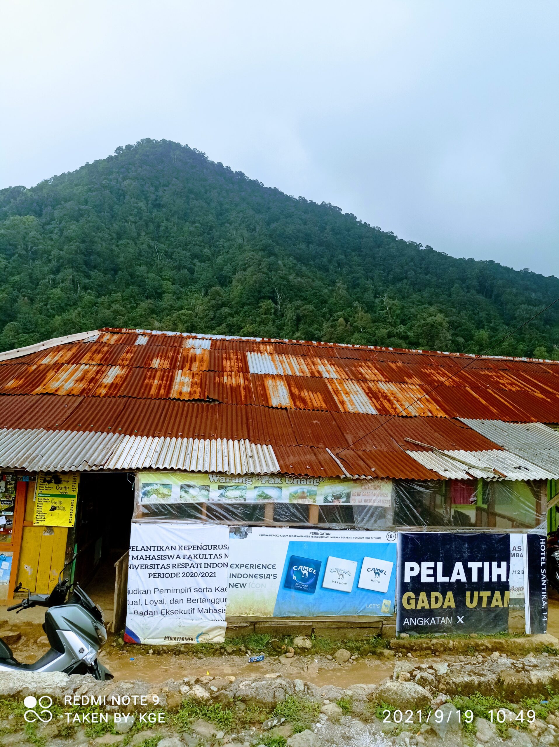 Warung Basecamp & Tempat Parkir Kendaraan. Gunung Kencana sudah terlihat menunggu dibelakang.