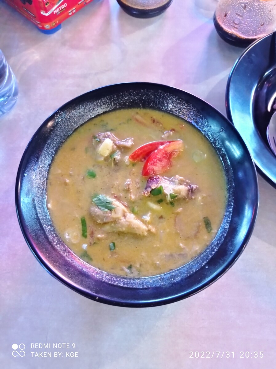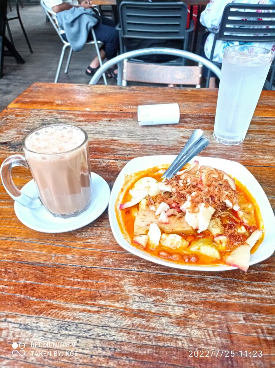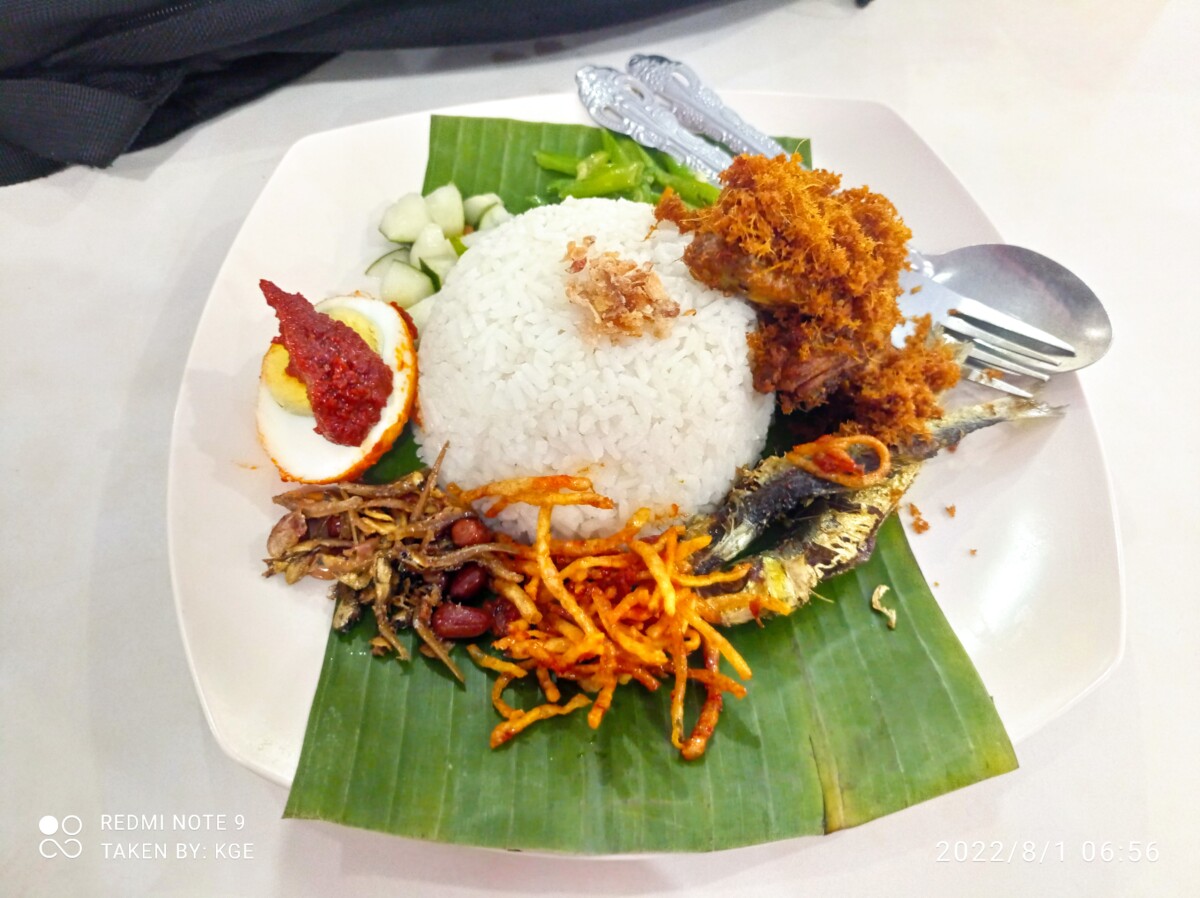 Kalau membahas makanan khas Melayu kurang lengkap rasanya kalau belum nyoba nasih lemak. Nasi lemak ini nasi udunknya versi masyarakat Melayu. Istilah ‘lemak’ merujuk pada rasa dan tekstur gurih berminyak yang dihasilkan santan kelapa. Nasi Lemak ini sangat khas karena dibuat dengan campuran santan, jahe, daun pandan, daun serai, sehingga menimbulkan aroma harum dan membuat orang semakin tidak sabar untuk mencicipinya. Nasi ini biasanya disajikan dengan tambahan cabai merah yang dicampur dengan ikan atau sotong. Salah satu tempat yang menyediakan menu nasi lemak adalah Kedai BK yang berada di pasar Mitra Raya. Disini nasi lemak disajikan dengan sayur tumis, ikan teri kacang, kentang balado, karena saya memesan yang versi komplit maka ditambahkan lauk ayam goreng, ikan asin, dan telur balado, benar-benar sarapan full carbo ini 😀 . 1 porsi nasi lemak komplit disini dihargai 31 ribu, lumayan mahal ya, tapi menurut saya worth it karena memang lauknya yang lengkap dan banyak, serta rasa nasi uduknya itu mantap, pulen dan gurih.