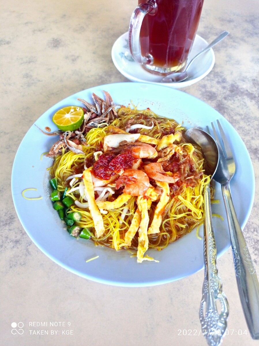 Pagi-pagi lagi pengen sarapan menu yang jarang di temui di Jakarta akhirnya searching-searching dan nemu info tentang Mie Siam. Mie Siam adalah salah satu makanan khas Melayu berbahan dasar bihun. Dalam satu porsi Mie Siam terdapat bihun, udang, bakso ikan, tauge, potongan cabai rawit dan potongan tahu. Mie siam ini diolah dengan bumbu-bumbu yang khas sehingga menghasilkan cita rasa yang manis dan asam. Salah satu tempat makan yang menyediakan sarapan mie siam adalah Kedai Seloka yang berada di Pasar Mitra Raya. 1 porsi mie siam disini dihargai 20 ribu, kalau ditambah minum teh manis hangat tinggal nambah 6 ribu. Di sekitaran pasar raya selain kedai Seloka ini juga berjejer kedai-kedai lain yang menyediakan berbagai macam makanan, tidak hanya makanan khas Melayu saja, makanan nusantara seperti mie ayam, dll juga banyak disini.