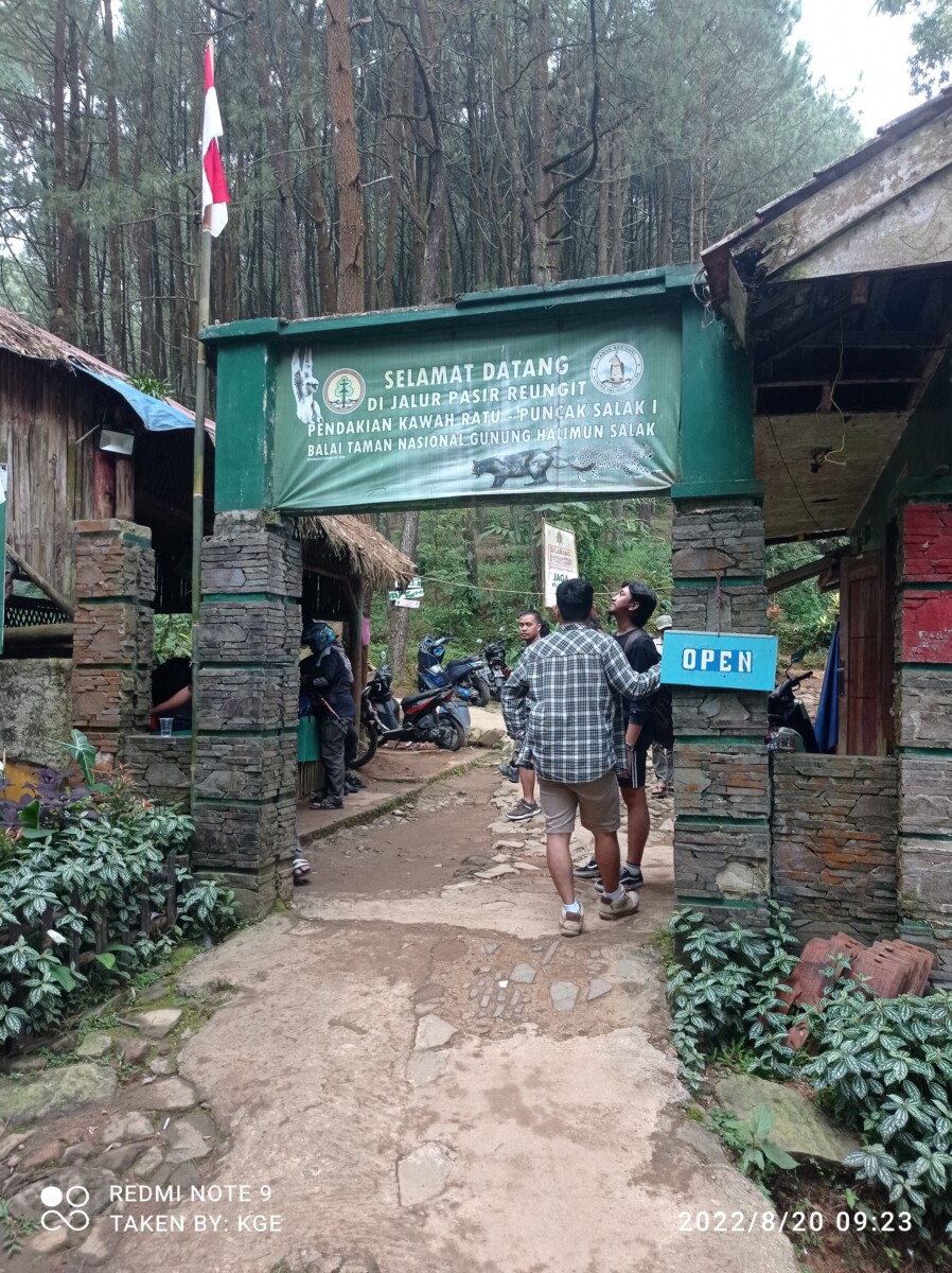 Sabtu pagi 20 Agustus 2022 saya bersama 3 orang teman, kami sudah berangkat dari Jakarta untuk menuju ke Kawah Ratu. Untuk naik ke kawah ratu sendiri bisa melaui 2 jalur pendakian, yaitu jalur pendakian Pasir Reungit Bogor, atau jalur pendakian Cidahu Sukabumi. Waktu itu kami memilih masuk melalu jalur Pasir Reungit. Untuk rute yang ditempuh adalah Grogol – Tol Dalam Kota Jakarta – Tol Jagorawi – Tol Lingkar Luar Bogor – Dramaga – Ciampea – Gunung Bunder – Pintu masuk kawasan Gunung Halimun Salak – Camping Ground Pasir Reungit. Jalan yang dilalui sudah bagus dan cukup layak, hanya setelah melewati pasar Gunung Bunder jalan menjadi sempit, dan disitu melewati pasar tumpah pagi hari, yang membuat sedikit repot buat sopir saat melewati pasar yang ramai dengan jalan sempit, belum lagi harus simpangan dan melewati angkot yang ngetem di pasar yang sudah sangat ramai itu. Sekitar jam 8 pagi setelah menempuh perjalanan sekitar 2,5 jam kami tiba di pintu masuk kawasan Gunung Salak. Kami berhenti sebentar disini untuk sarapan pagi nasi uduk yang sudah dibeli saat tadi mau berangkat. Untuk masuk kawasan taman nasional gunung Salak HTM nya sebesar 15 ribu per orang + 15 ribu untuk 1 mobil. Disini suasana asri sudah sangat terasa, pemandangan khas pegunungan yang dikelilingi pohon lebat disekitarnya yang mengelilingi. Di sini juga terdapat bangunan perpustakaan kecil yang berisi majalah tentang gunung Salak yang bisa dibaca-baca.