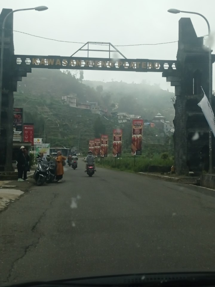Sekitar pukul 10:50 setelah menempuh perjalanan selama hampir 6 jam dengan sempat berhenti lama di Ambarawa untuk sarapan, akhir nya kami sudah mulai masuk ke kecamatan Dieng, Wonosobo. Suasananya mendung dipenuhi kabut, dan suhunya memang begitu dingin. Maka wajar saja kalau Dataran Tinggi Dieng disebut negeri diatas awan. Rencananya kami mau beli logistik pendakian di indomaret/alfamart sekitaran dieng ini, tapi pas perjalanan kok ga ketemu2. Tau-tau setelah sekitar 10 menit perjalanan sudah tiba di gerbang masuk Registrasi Pendakian Gunung Prau via Patakbanteng. Ya sudah akhirnya kami memilih melanjutkan masuk gang kecil sekitar 700 meter untuk melajukan mobil menuju parkiran Pos Registrasi Patakbanteng. Kami tiba disana sekitar pukul 11:10 pagi.