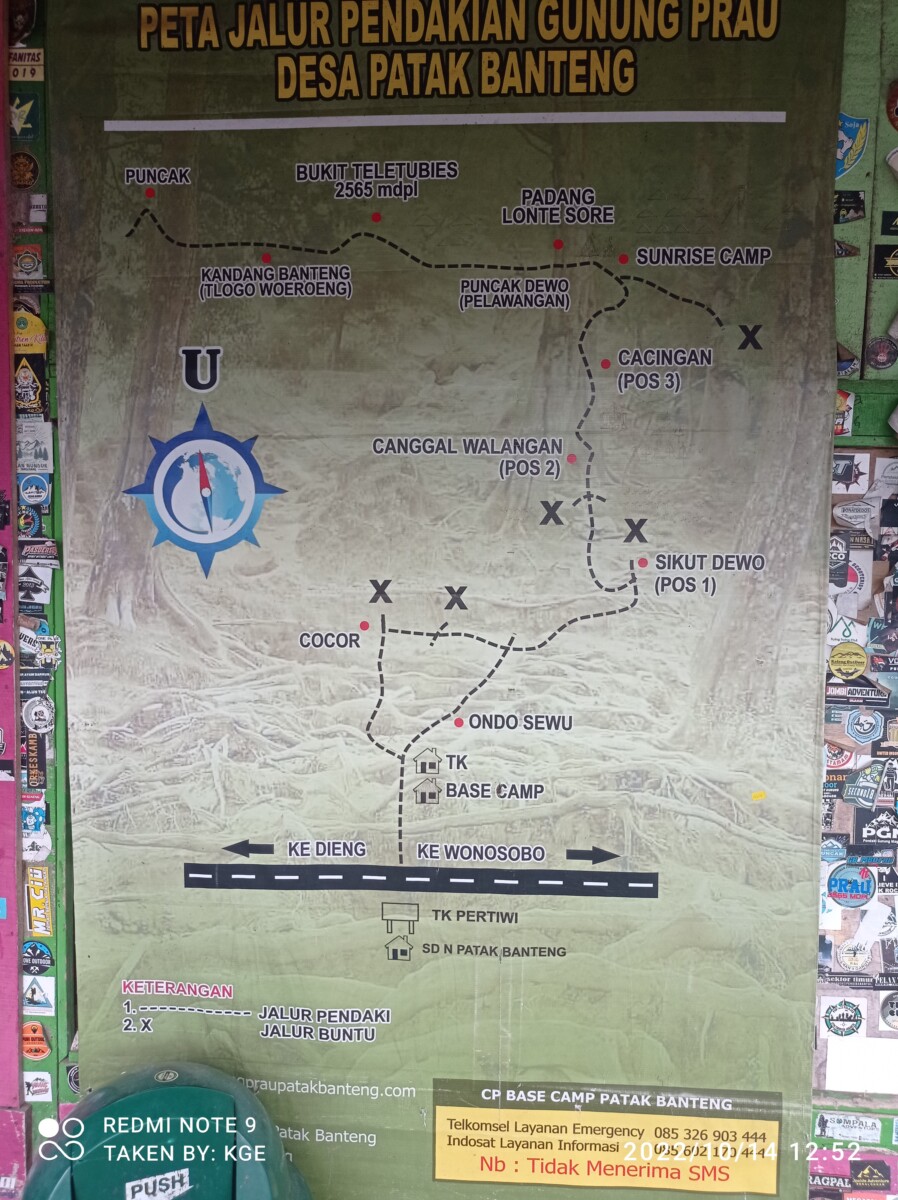 Sekilas mengenai Gunung Prau, gunung ini adalah salah satu gunung di Dieng, Jawa Tengah dan memiliki ketinggian puncak 2.590 mdpl. Gunung ini merupakan tapal batas empat kabupaten di Jawa Tengah, yaitu Kabupaten Batang, Kabupaten Kendal, Kabupaten Temanggung dan Kabupaten Wonosobo. Untuk naik ke Gunung Prau ada 6 jalur resmi, yaitu via: Wates, Dieng, Patakbanteng, Dwarawati, Kalilembu, dan Igirmranak. Jalur pendakian Gunung Prau via Patakbanteng merupakan jalur pendakian Gunung Prau yang paling digemari oleh para pendaki pemula. Hal ini karena jalur pendakian Gunung Prau via Patakbanteng cenderung lebih mudah & singkat jika dibandingkan jalur lain, ya meskipun kenyataannya nanti pas mendaki banyak jalur terjal yang lumayan menguras tenaga pendaki pemula seperti kami, pemandangannya bagus dan fasilitas wisatanya lengkap. Tujuan pendaki gunung Prau biasanya adalah menuju sunrise camp Patakbanteng yang berada sedikit dibawah puncak gunung yaitu di ketinggian 2565 mdpl, karena spot terbagus adalah disini, dimana kalau cuaca cerah kita bisa melihat pemandangan Gunung Sindoro & Sumbing tepat didepan mata, sementara Gunung Merbabu & Merapi akan terlihat dari kejauhan. Namun apakah nanti kami bisa mendapatkan view itu semua, mengingat kami mendaki di musim penghujan? 😀