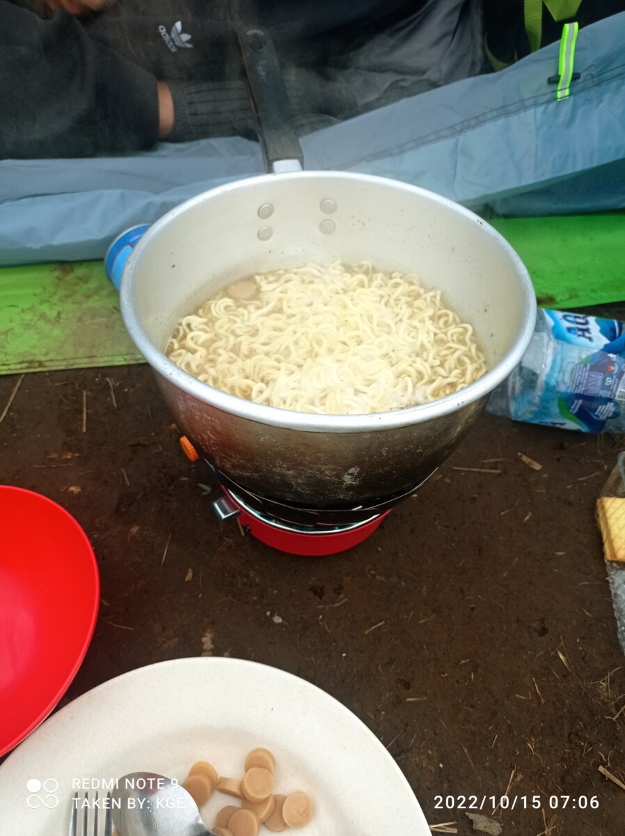 Sambil menunggu sunrise, siapin sarapan dulu. Menu andalan ketika mendaki gunung tentu saja adalah indomie + telur + sosis. Ya karena makanan sesederhana apapun entah kenapa kalau dimakan di gunung rasanya akan selalu enak, karena bareng sambil menikmati suasananya yang sejuk & pemandangan yang indah.